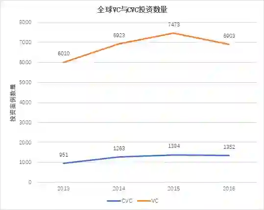 从投资案例数量上看,2015年共发生7473笔风险投资,CVC投资数量占比达到19%。2016年度,在资本寒冬的大形势下,风险投资行业总交易活动下降了8%,CVC活动下降了2%。