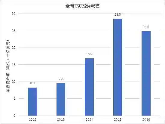 2016年,全球CVC共计投资金额249亿美元。相比2015年, CVC交易金额在连续三年增长后首次下降,降幅12.6%;之前3年增长率分别为15.7%、76.0%和45.0%。在资本寒冬下,CVC的活跃程度与整个风险投资行业保持一致。