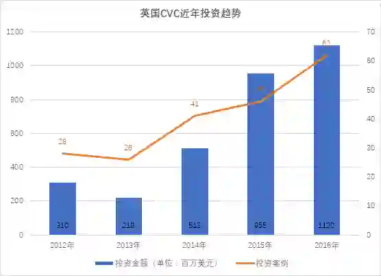 英国的CVC投资相较美国还处于初期,近几年整年投资案例数少于100个,但增速较快。2016年英国CVC投资案例62起,投资总金额11.2亿美元,相比于2012年,投资数量和金额分别增长220%和360%,项目平均投资由1100万美元增加到1800万美元,增加了64%。