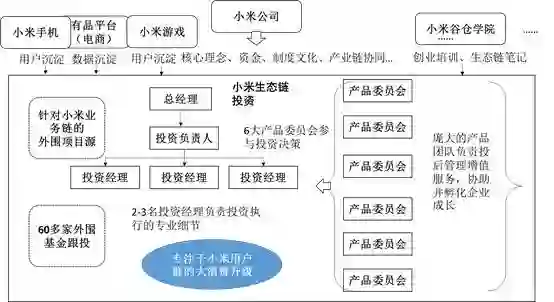 基于产品驱动的生态链投资逻辑,小米生态链投资管理模式与传统的投资机构或者一般企业的投资业务部门相比也有较大不同。一方面,其投资团队相对人数较少,目前仅有2-3名,主要负责投资过程中的专业细节操作。而投资决策团队除投资负责人外,还有6大产品委员会深入参与。另一方面,小米生态链投资拥有庞大的投后团队,协助被投企业做产品孵化,并纳入小米生态链产生协同作用,目前,每年的投后大会已经形成一定的影响力品牌规模效应。