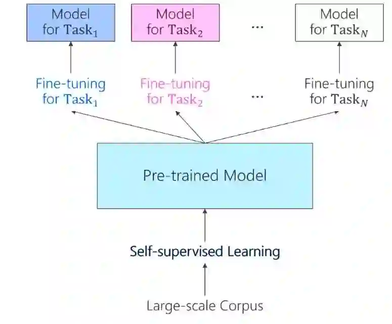 。对大型数据库做 Self-supervised learning,针对大规模语料进行训练,可以得到预训练模型。