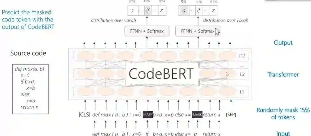 CodeBERT是一个可处理双模态数据的新预训练模型,使用了 Transformer 作为基本网络结构,采用混合目标函数:掩码语言模型和替换 Token 检测。