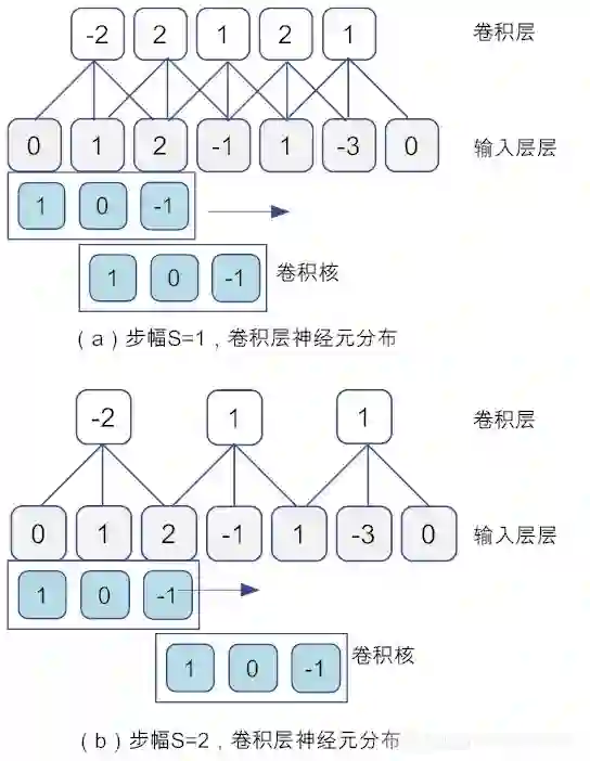(2)步幅(stride):即滤波矩阵在输入矩阵上滑动跨越的单元个数。设步幅大小为S,当S为1时,滤波器每次移动一个像素的位置。当S为2时,每次移动滤波器会跳过2个像素。S越大,卷积得到特征图就越小。以一维数据为例,当卷积核为[1,0,-1],输入矩阵为[0, 1, 2, -1, 1, -3, 0]时,图11-5显示了步幅分别为1和2卷积层的神经元分布情况。