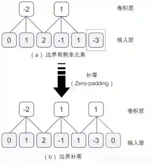 下面我们举例说明这个概念。假设步幅S的大小为2,为了简单起见,我们假设输入数据为一维矩阵 [0, 1, 2, -1, 1, -3],卷积核为[1, 0, -1],在卷积核滑动两次之后,此时输入矩阵边界多余一个“-3”,不够滑动第3次,如图11-6-(a)所示。此时,便可以在输入矩阵填入额外的0元素,使得输入矩阵变成[0, 1, 2, -1, 1, -3, 0],这样一来,所有数据都能得到处理,如图11-6-(b)所示。。