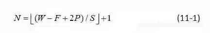 综上所述,在构造卷积层时,对于给定的输入数据,如果确定了卷积核的大小,卷积核的深度(个数)、步幅以及补零个数,那么卷积层的空间安排就能确定下来。以一维数据为例,假设数据的大小(数据元素的长度)为W,卷积核的深度为F,步幅大小为S,补零的数目为P,那么对于每个卷积核,在它与输入数据实施卷积操作后得到特征图谱,它包含的神经元个数N可以用(11-1)公式计算得到。