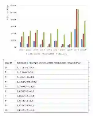 falcon_conv 是机器智能技术团队开发的一款由 CUDA C++编写,在 Nvidia GPU 上运行的低精度卷积库,它接受 2 份低精度(INT8)张量作为输入,将卷积结果以 float/int32 数据输出,同时支持卷积后一些常规操作(scale,batchnorm,relu… )的合并。我们在单张 Tesla P4 GPU 上,对 falcon_conv 的性能与 Nvidia 官方计算库 Cudnn v7.1 做了比较,如图所示。几乎所有情况 falcon_conv 都优于 Cudnn,个别用例有高至 5 倍的提升,用例选自 RESNET 和 VGG 中耗时较多的卷积参数。