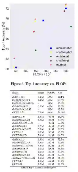 我们提出的新型网络由于每个单元的计算比较密集,并不存在过多的碎片操作,是非常适合在通用硬件上运行的。在公开数据集 ImageNet 上,我们在 40MFLops 计算量上相比目前业内最优的 shufflenet v2 结构,准确度提升了 2%。