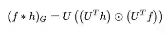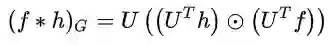 由上面可知, 和卷积核 的傅里叶变换结果 和 (均为列向量), 和 的卷积为 其分别傅里叶变换后的乘积的逆变换, 故Graph卷积公式为如下: