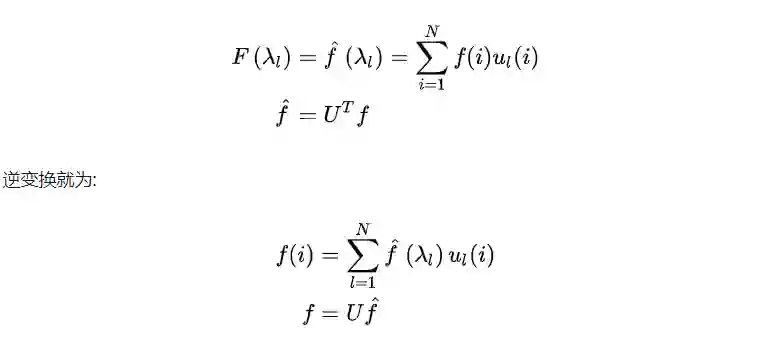 拓扑图的拉普拉斯矩阵L的特征向量矩阵为 , 那么特征值 (频率)所对应的特征向量 可作为傅里叶变换中的一个正交基, 计算得到 的傅里叶变换(不考虑复数情况):