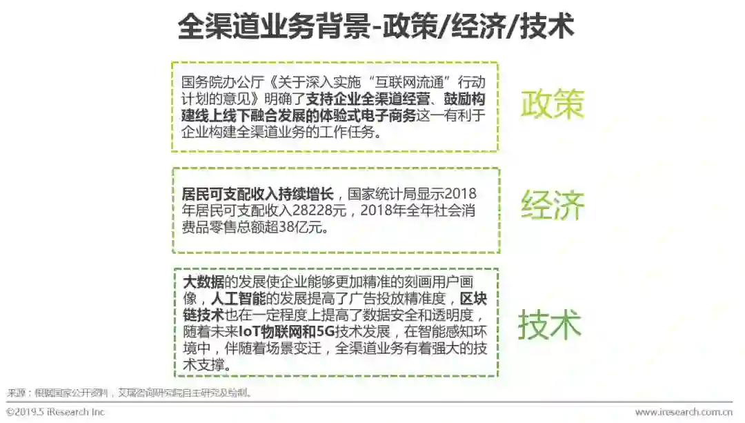背景:政策、经济、技术为品牌商发展全渠道打造良好环境,消费习惯与人口特征共同要求全渠道业务发展