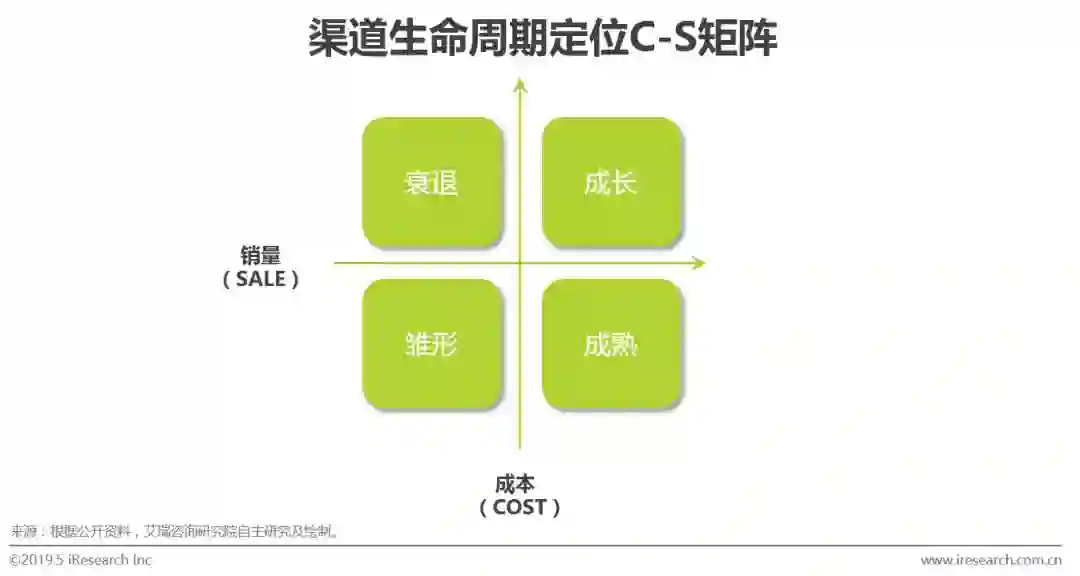 渠道的生命周期分为四个阶段,分别是建设期、成长期、成熟期和衰退期。在建设初期,渠道和运营都比较粗放;成长期则加快渠道拓展,运营管理更加精细化;成熟期的渠道则比较稳定,价值得到更好的体现;处于衰退期的渠道,将被替代。鉴于不同渠道可能处于不同阶段、同一个渠道在不同地区也有不同的发展,在全渠道业务的布局过程中,艾瑞商业咨询可通过渠道生命周期定位矩阵为企业判断某渠道目前所处的生命周期及其效率,为企业新增或优化现有渠道提出建议。