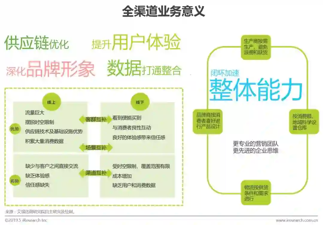 线上线下渠道在客群、场景、渠道三大方面互补,线下体验为线上拉新提供流量,线上购买、支付为线下场景提供便利。提升用户体验、深化品牌认知,企业将收获更多的潜在商业价值。同时,通过全渠道销售,促使企业完善升级自己的供应链系统、优化企业与供应商、分销商之间的协作能力、提升企业数据搜集、整合、分析能力、打造更专业的营销团队和更先进的互联网思维,从而增强企业自身的生态价值。
