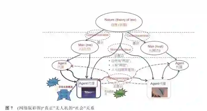 无人机在自然界能作为一完整独立的个体,它应融入自然界中,它应与自然界、作为其主人的人和对手有密切的关联,否则难以达到自主智能的高境界,无人机本体与自然和人以及代理同时有关系才能实现“真正”的自主与智能功能。图7示出了“真正”无人 机的“社会”关系。
