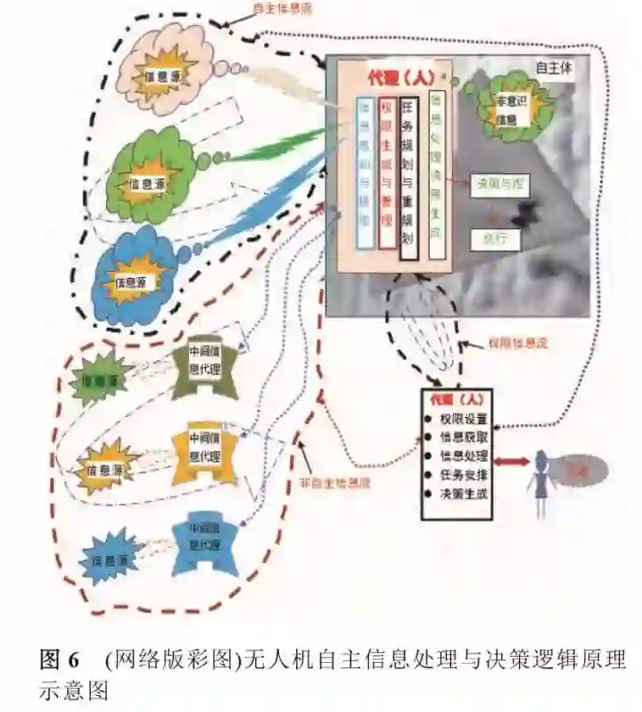 总之,为能实现上面3个等级的自主智能控制,“创造”出完整与完善的无人机, 应遵循下面的“创造”原则:在保证自主与智能的前提下,应借助其他手段和传感器充分获取和利用一切可用的信息,这样可起到事半功倍的效果和作用,强调自主与智能必需确保底线。为实现这一原则,无人机必需具有3个信息环:自主信息环、非自主(外来辅助)信息环、权限信息环(高智能还应有无意识信息环);信息的获取、处理与应用以及任务决策必须保证自主完成,这需要构造“代理机构”来实现,至少有两个“代理”,一是在地面上的“代理”, 完成人的指令构造与分发,二是在飞机上的“代理”,实现完善的自主智能管控,其作用最为关键,是核心功能“构件”,没有此“代理”,无人机就无法实现真正的自主智能使命。图6示出了无人机信息流与结构。