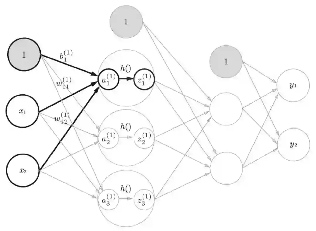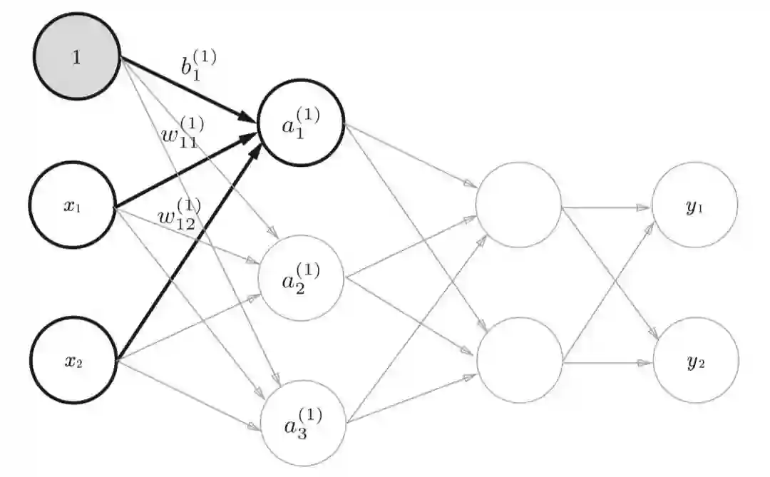 下图是一张我随便找来的神经网络图,我们可以看到输入的第一个节点被置为了1。这样做是为了方便引入偏移量,只是我们一般情况下画图的时候,不会特意把偏移量画出来。我们以下图为例子来看下神经网络当中信号的传递方式。
