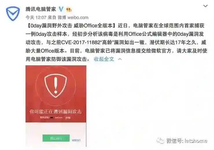 近日,宅客频道从腾讯电脑管家官方微博看到一则消息:腾讯安全反病毒实验室在全球范围内捕获了一例病毒样本,并顺藤摸瓜扒出了一个潜伏 17 年之久的 0day 漏洞——该病毒利用 Office 公式编辑器中的 0day 漏洞发动攻击,与之前 CVE-2017-11882“高龄”漏洞如出一辙,潜伏期长达 17 年之久,威胁大量 Office 版本,一旦用户打开恶意文档,无需其他操作,就会被植入后门木马,被不法分子完全控制电脑。