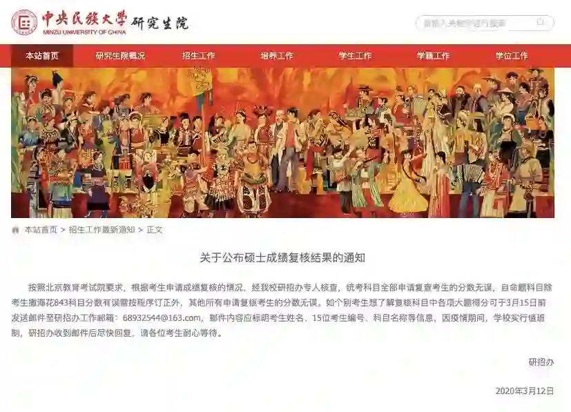 按照北京教育考试院要求,根据考生申请成绩复核的情况,经我校研招办专人核查,统考科目全部申请复查考生的分数无误,自命题科目除考生撒海花843科目分数有误需按程序订正外,其他所有申请复核考生的分数无误。如个别考生想了解复核科目中各项大题得分可于3月15日前发送邮件至研招办工作邮箱:68932544@163.com,邮件内容应标明考生姓名、15位考生编号、科目名称等信息,因疫情期间,学校实行值班制,研招办收到邮件后尽快回复,请各位考生耐心等待。
