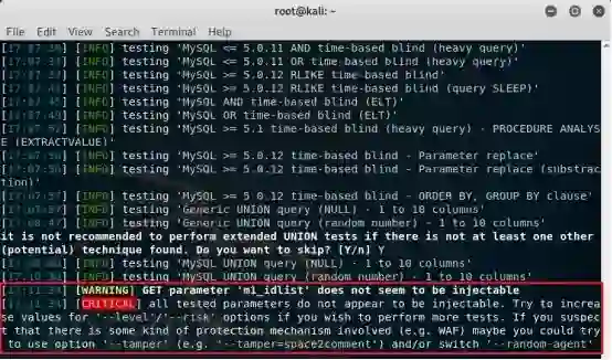 2.3 等待了一段漫长的时光,sqlmap的扫描结果如下图所示(居然告诉我没有漏洞,唉,看来神器也有靠不住的时候):