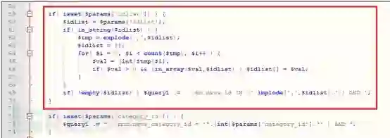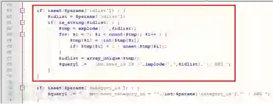 修复后的代码与之前的问题代码相比较,主要有三处改动:一、在将变量idlist的值分解为数组赋值给变量tmp之后,idlist被置为空;二、新增变量val,用于将强制类型转换后的数据传递给idlist;改变if语句判断条件和操作,防止发生count($tmp)-1和重复字符的操作。