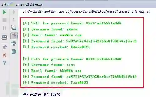 2. 通过命令main()来调用main函数,运行该SQL盲注漏洞利用程序,结果如下:可以看到获取到了全部用户的salt值、用户名、Email以及密码密文和明文,与MySQL数据库中记录的内容完全一致,数据库信息详见下图: