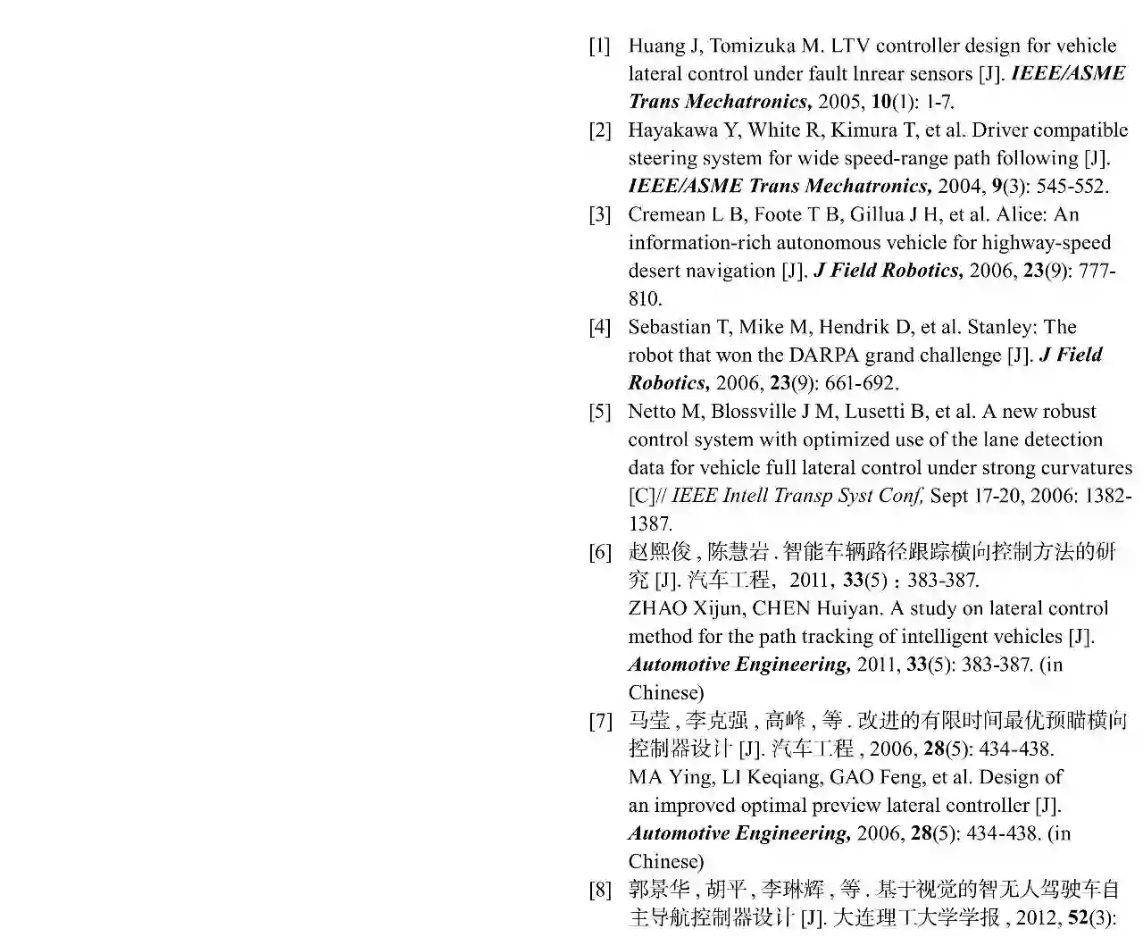 智能车辆是车辆工程领域的研究前沿和未来汽车工业发展的新方向,其智能化集中体现在智能安全驾驶方面。严峻的交通安全、能源浪费和环境污染等问题,使得智能车辆作为智能交通系统的一个重要组成部分日益受到重视。