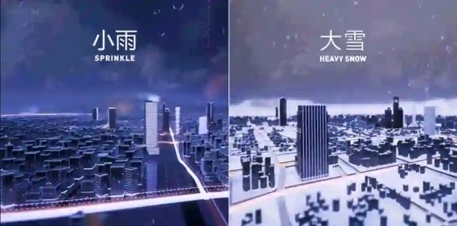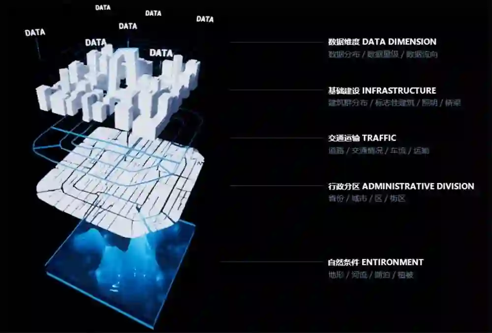 数据维度层是最核心的部分,位于场景上方最突出的位置,能够更清晰的展示风险数据的分布、量级;行政区域和交通层是城市场景最基础的数据维度,方便用户进行区域的数据对比和分析;基础建设层包括城市的建筑、标志性建筑、照明、桥梁、等,还原城市独特风貌;通过突出城市的标志性建筑,强化城市、区域的识别性,辅助数据传达;自然条件层包括地形、河流、植被、展示真实的环境特征,用户更有代入感。