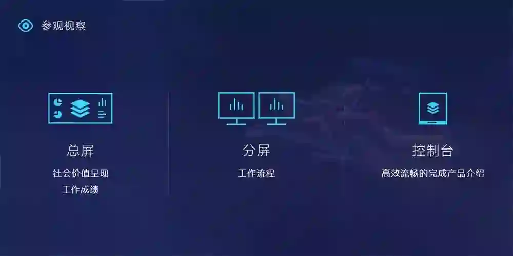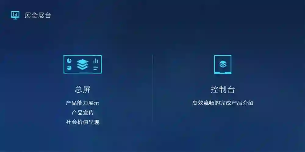 不同于工作场景,灵鲲产品在展会中展台的主要受众是参会人士,除了一般民众外,更有价值的观众主要来自于媒体和潜在客户等。所以在这个场景中展示的内容与实际工作中的数据可视化内容有一定的区别,更多的是对产品能力的展示、产品的宣传以及社会价值的呈现。如何直观的呈现产品的能力,并使观众快速获得有价值的信息并留下深刻印象非常重要。这也决定了在这个场景中,用户不仅包括观众,也包括演讲者。我们需要考虑如何通过控制端让讲演者高效而流畅的完成产品介绍。