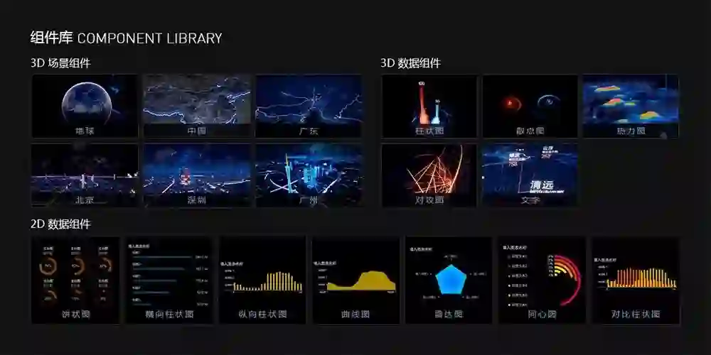 为了提升产品搭建的效率,降低了研发周期和成本,产品功能模块实现了组件化,分为3D场景组件、3D数据组件、2D数据组件。任何一位设计师都可以根据产品需求,搭配组件模块,快速搭建大数据可视化产品。