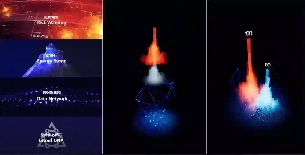 灵鲲的3D数据样式有柱状图和散点图。如何把司空见惯的数据样式,设计出产品的个性,是我们重点要解决的问题。为了体现大数据的力量感,使用科幻电影中的聚合能量、发光的能量石作为柱状图的主图形;同时把数据采集、融合、分析的过程具象为动态粒子网络,作为辅助图形。数据图形和结构中都融合了品牌 DNA 的三角图形,数据样式更具有品牌的个性。
