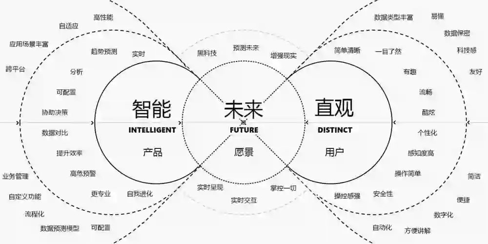 为了打造灵鲲产品的可视化,在竞品中脱颖而出,我们从产品功能、用户、愿景三个维度发散,提炼出设计指南的关键词:智能、直观、未来,塑造独特的大数据可视化风格体系。