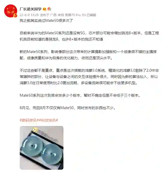 据数码博主 @厂长是关同学的最新爆料,华为 Mate 50 将于 8 月发布,可能有骁龙 8+ 版本,搭载鸿蒙 3.0 系统。