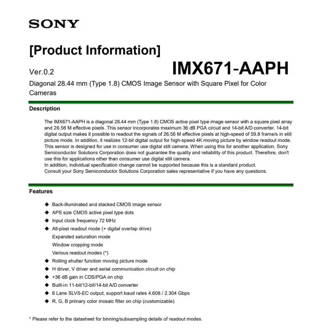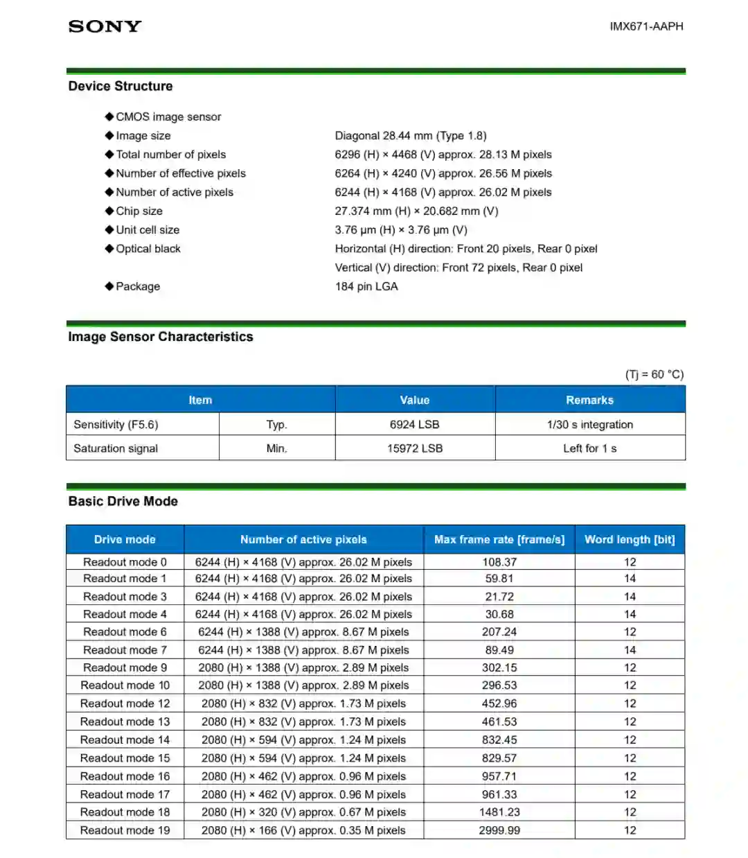 不久前 FujiAddict 曝光了索尼 IMX671-AAPH 传感器的规格表,它很可能用于已经发布的富士 X-H2S 相机以及索尼新 ZV 系列相机。