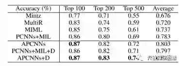 文章在远程监督常用的数据集(Rediel 2010)上,按照常规的远程监督的实验思路,分别进行了 heldout 和 manual 实验。Heldout 实验即使用知识库中已有的关系实例标注测试集,验证模型的性能,结果如下面的 Precision-Recall 图所示,超过其他最好的方法。