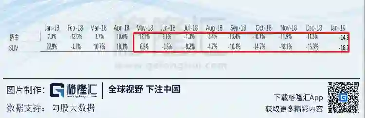 轿车同比下滑14.9%,SUV同比下滑18.9%,MPV下滑27.4%。自2018年5月以来,suv增速一直跑输轿车增速,SUV得益于低基数的增长爆发有可能已经成为过去式,目前SUV销量和轿车销量差距已经不大。