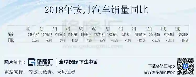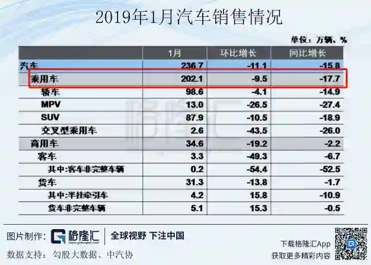 乘用车销量同比继续大幅下滑:昨天中汽协发布1月销量数据,2019年1月狭义乘用车202.1万辆,同比下降17.7%。从这个总量数据上来看,自2018年7月乘用车月销量同比下滑至今,需求端并没有出现改善,1月的销量增速甚至出现了恶化。