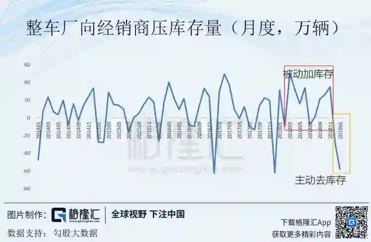 2018年的大部分时间都处于被动加库存的状态,汽车卖不出去,经销商的存货越来越高。 然而到了2018年12月行业已经开始进入主动去库存状态,这也可以同时从各家车企的产销快报数据中得意证实,如吉利汽车在12月的快报中声明其正在为经销商去库存,上汽集团、长安汽车也正在进行主动去库存。