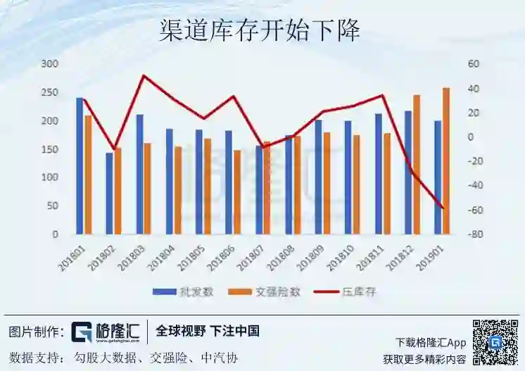 计算压库存的数量可以通过批发销量与上述两者之一作差得到。由下图我们可以看到在2018年大部分时间里零售数据都是高于交强险数据的,这会导致对行业实际库存的低估。但是从2018年11月份开始,交强险数据开始赶超零售数据,到12月已经反超持续至一月份,这会导致对行业库存的高估,但实际结果其实应该是更加乐观的。