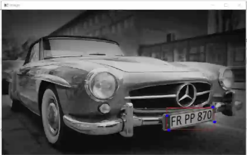 此外,DBNet的官方代码里提供了转换到onnx模型文件,于是我依然编写了一套使用opencv部署DBNet文字检测的程序,依然是包含C++和Python两个版本的代码。官方代码的模型是在ICDAR场景文本检测数据集上训练的,考虑到车牌里也含有文字,我把文章开头展示的汽车图片作为输入,程序检测结果如下,可以看到依然能检测到车牌的4个角点,只是不够准确。如果想要获得准确的角点定位,可以在车牌数据集上训练DBNet。