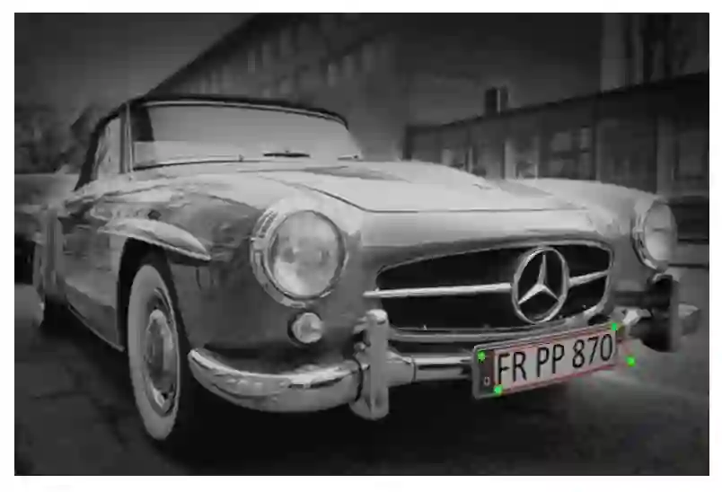 在输出车牌检测框的同时输出检测到的车牌的4个角点。有了这4个角点之后,对车牌做透视变换,这时的车牌就是水平放置的,最后做车牌识别,这样就做成了一个车牌识别系统,在这个系统里包含车牌检测,车牌矫正,车牌识别三个模块。车牌检测模块使用retinaface,原始的retinaface是做人脸检测的,它能输出人脸检测矩形框和人脸5个关键点。考虑到车牌只有4个点,于是修改retinaface的网络结构使其输出4个关键点,然后在车牌数据集训练,训练完成后,以一幅图片上做目标检测的结果如上图所示。车牌矫正模块使用了传统图像处理方法,关键函数是opencv里的getPerspectiveTransform和warpPerspective。车牌识别模块使用Intel公司提出的LPRNet。
