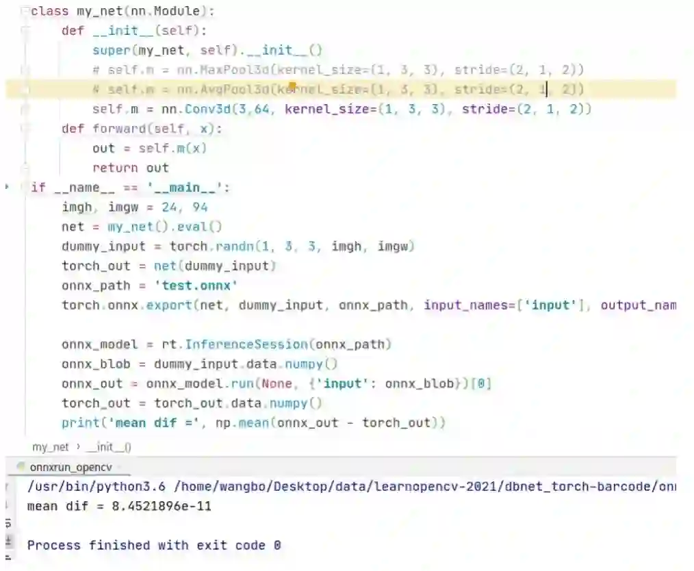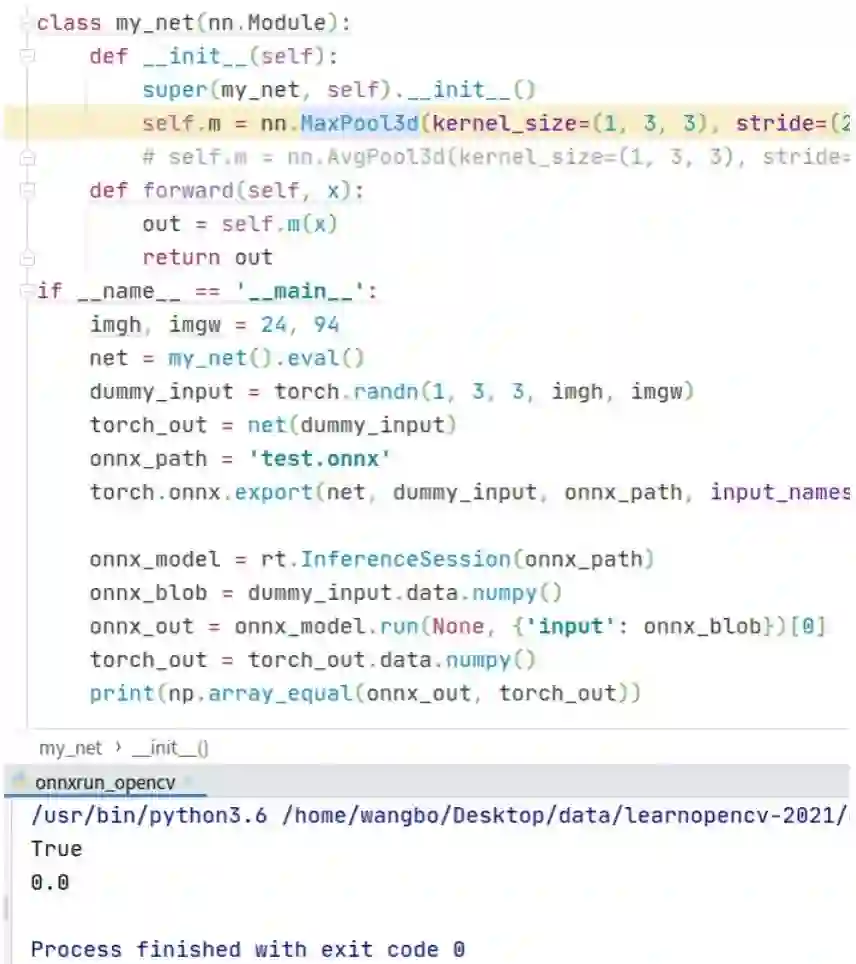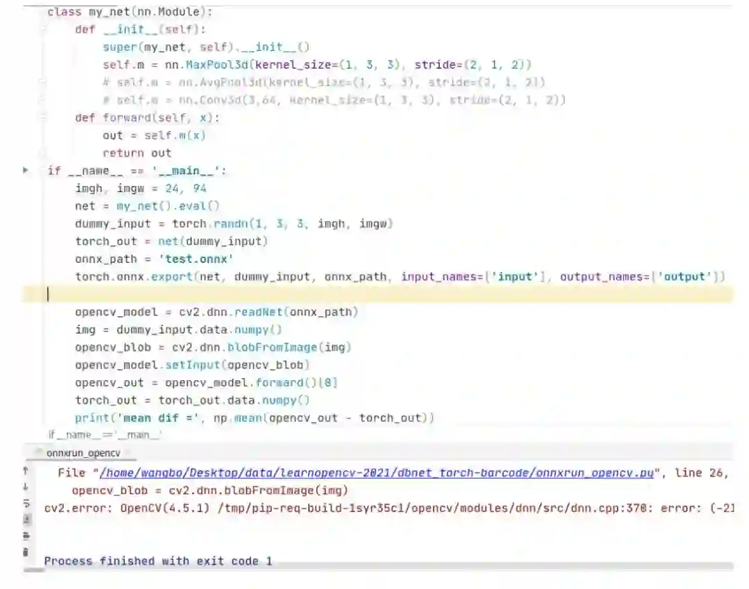 在修改这个代码bug后重新生成onnx文件,使用opencv读取onnx文件做前向计算就不再出现异常错误了。