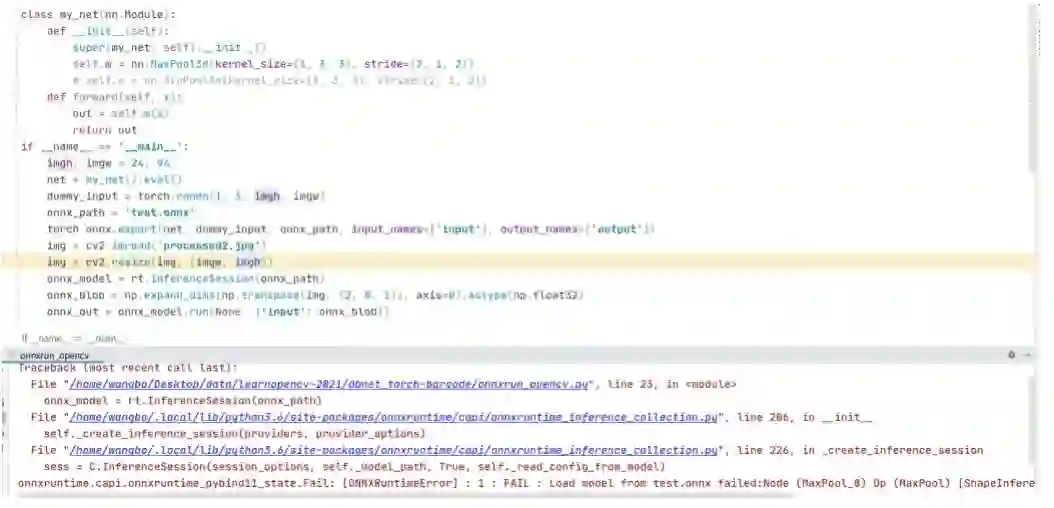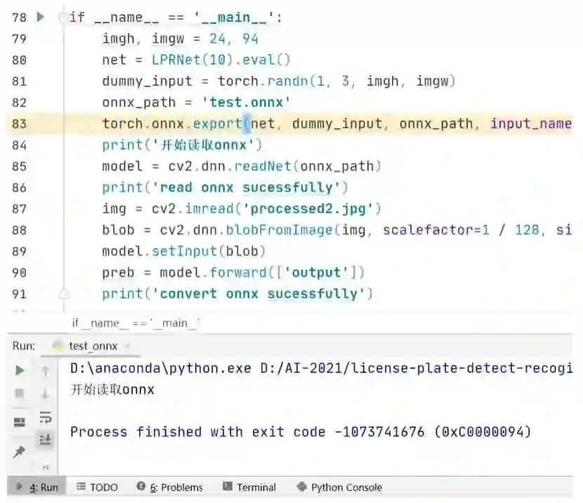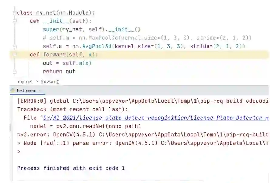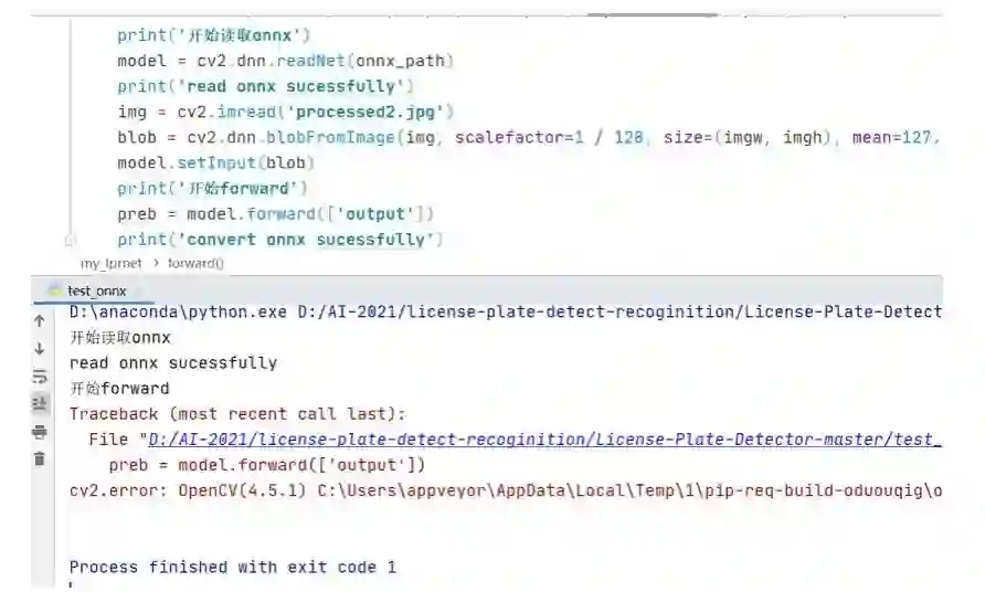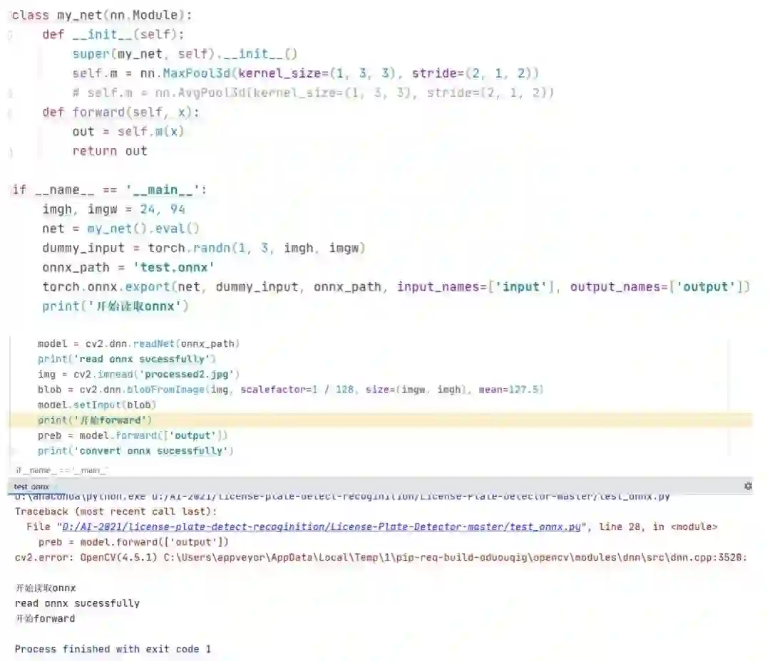 接下来我就尝试把pytorch模型转换到onnx文件,然后使用opencv做车牌检测与识别。然而在转换完成onnx文件后,使用opencv读取onnx文件遇到了一些坑,我在网上搜索,也没有找到解决办法。