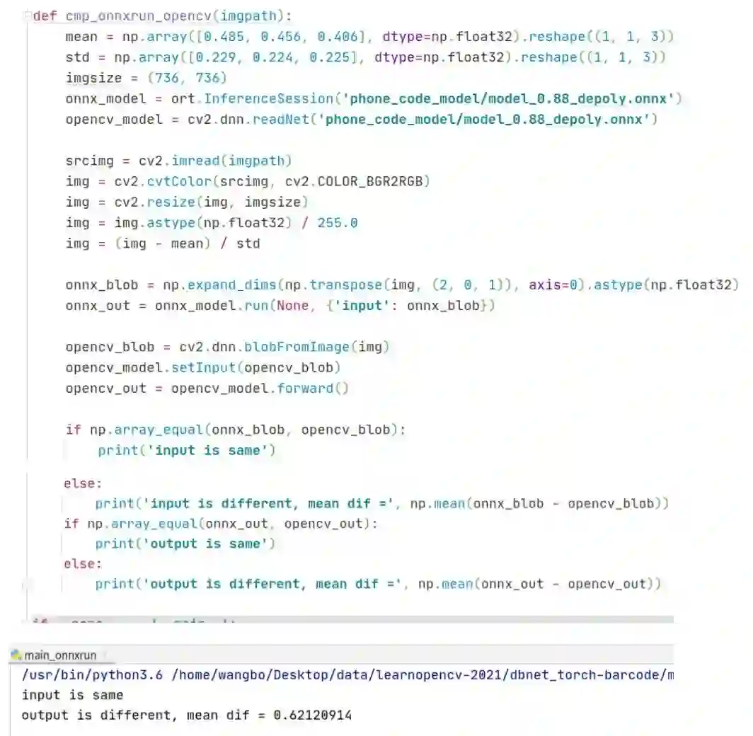 并且我还编写了一个函数比较opencv和onnxruntime的输出结果,程序代码和运行结果如下,可以看到在相同输入,读取同一个onnx文件的前提下,opencv和onnxruntime的输出结果竟然不相同。