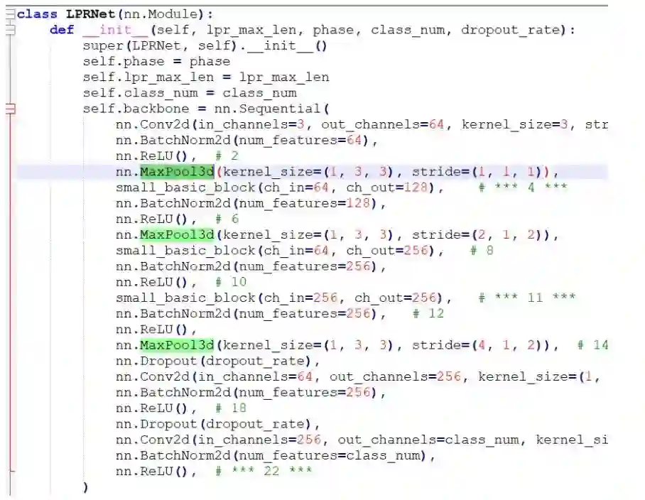 从打印结果看,torch.onnx.export生成onnx文件时没有问题的,但是在cv2.dnn.readNet这一步出现异常导致程序中断,并且打印出的异常信息是一连串的数字,去百度搜索也么找到解决办法。观察LPRNet的网络结构,发现在LPRNet里定义了3维池化层,代码截图如下