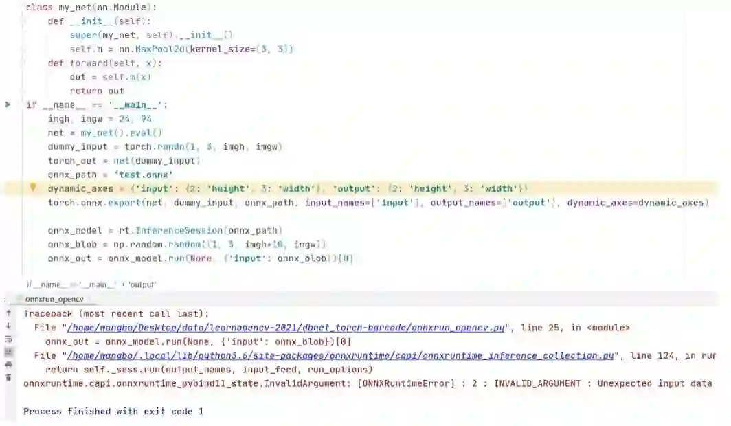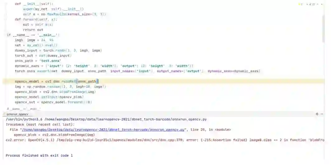 可以看到,在生成onnx文件后,使用onnxruntime库读取,对输入blob的高增加10个像素单位,在run这一步出错了。使用opencv读取onnx文件,代码和运行结果的截图如下,可以看到依然出错了。