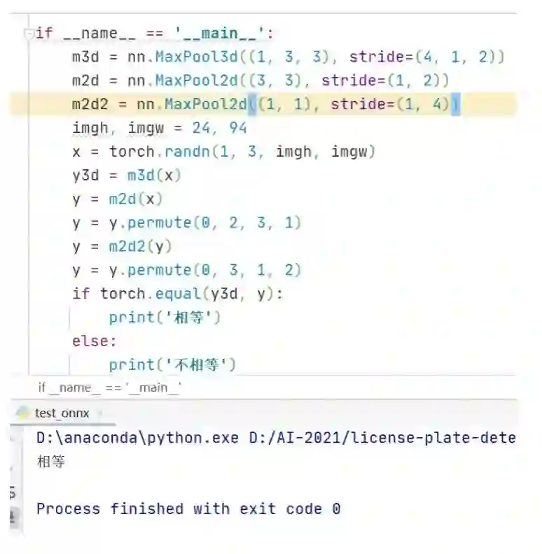 程序最后最后运行结果打印信息是相等。从这里就可以看出opencv里的深度学习模块并不支持3维池化的前向计算,这期待后续新版本的opencv里能添加3维池化的计算。这时在LPRNet网络结构定义文件里修改3维池化层,重新生成onnx文件,opencv读取onnx文件执行前向计算后依然出错,运行结果如下。