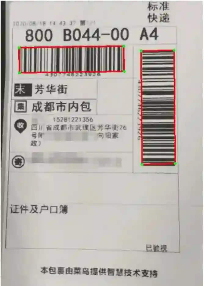 起初在github上看到一个使用DBNet检测条形码的程序,不过它是基于pytorch框架做的。于是我编写一套程序把pytorch模型转换到onnx文件,使用opencv读取onnx文件做前向计算。编写完程序后在运行时没有出错,但是最后输出的结果跟调用pytorch 的输出结果不一致,并且从可视化结果看,没有检测出图片中的条形码。这时在看到网上有很多使用onnxruntime部署onnx模型的文章,于是决定使用onnxruntime部署,编写完程序后运行,选取几张快递单图片测试,结果如下图所示DBNet检测到的4个点,图中绿色的点,红色的线是把4个连接起来的直线。