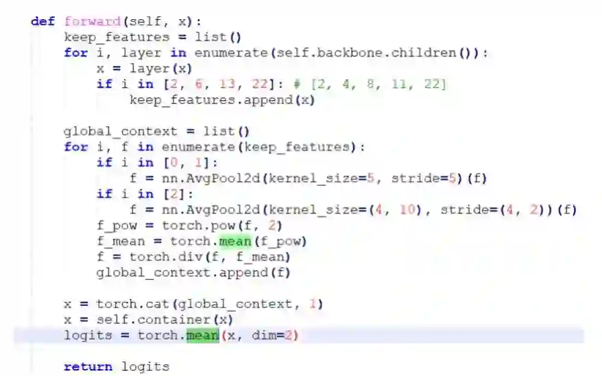 于是继续观察LPRNet的网络结构,在forward函数里看到有求平均值的操作,代码截图如下所示