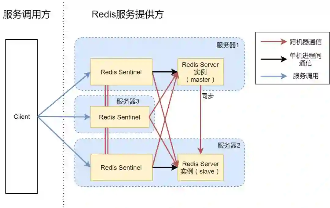 至此,我们就用3台机器搭建了一个高可用的Redis服务。其实网上还有更加节省机器的办法,就是把一个Sentinel进程放在Client机器上,而不是服务提供方的机器上。只不过在公司里面,一般服务的提供方和调用方并不来自同一个团队。两个团队共同操作同一个机器,很容易因为沟通问题导致一些误操作,所以出于这种人为因素的考虑,我们还是采用了方案4的架构。并且由于服务器3上面只跑了一个Sentinel进程,对服务器资源消耗并不多,还可以用服务器3来跑一些其他的服务。