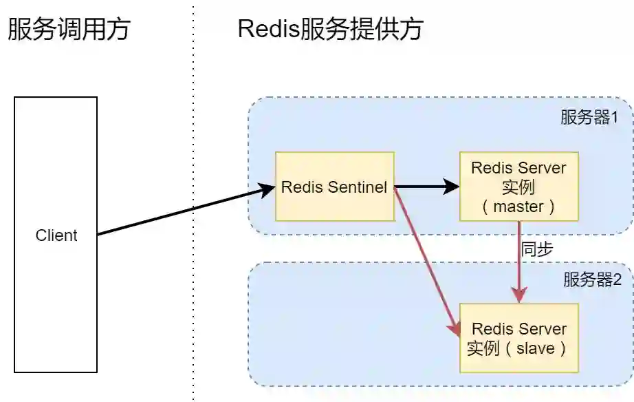 一般情况下,我们搭的个人网站,或者平时做开发时,会起一个单实例的Redis Server。调用方直接连接Redis服务即可,甚至Client和Redis本身就处于同一台服务器上。这种搭配仅适合个人学习娱乐,毕竟这种配置总会有单点故障的问题无法解决。一旦Redis服务进程挂了,或者服务器1停机了,那么服务就不可用了。并且如果没有配置Redis数据持久化的话,Redis内部已经存储的数据也会丢失。