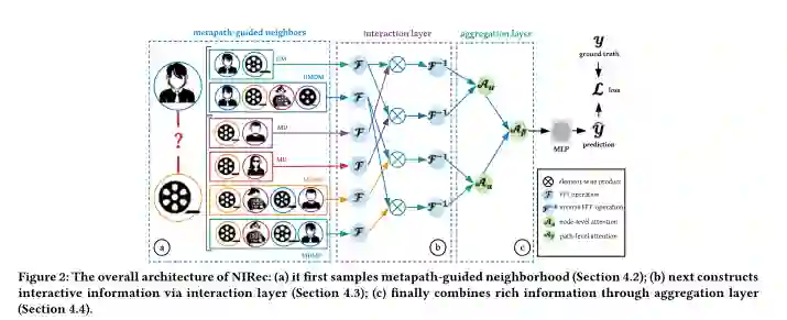 摘要:近年来,基于异构信息网络(HIN)的推荐系统大量涌现,因为HIN能够刻画复杂的图形,并且包含丰富的语义。现有的方法虽然取得了性能上的提高,但同时在实用性方面,仍然面临着以下问题。一方面,大多数现有的基于HIN的方法依赖于显式路径可达性来利用用户和项目之间基于路径的语义相关性,例如基于元路径的相似性。但由于路径连接稀疏或有噪声,这些方法很难使用和集成,并且通常具有不同的长度。另一方面,其他基于图的方法旨在通过在预测前将节点及其邻域信息压缩成单个嵌入来学习有效的异构网络表示。这种弱耦合的建模方式忽略了节点之间丰富的交互,这带来了先前概述的问题。针对上述问题,本文提出了一种端到端基于邻域的交互推荐模型(NIRec)。具体地说,我们首先分析了学习交互在HINS中的重要性,然后提出了一种新的公式,通过元路径引导的邻域来捕捉每对节点之间的交互模式。然后,为了探索元路径之间的复杂交互和处理大规模网络上的学习复杂性,我们用卷积的方式表示交互,并使用快速傅立叶变换进行高效的学习。在四种不同类型的异构图上的大量实验表明,与现有技术相比,NIRec的性能有所提高。据我们所知,这是在基于HIN的推荐中提供有效的基于邻域的交互模型的第一项工作。